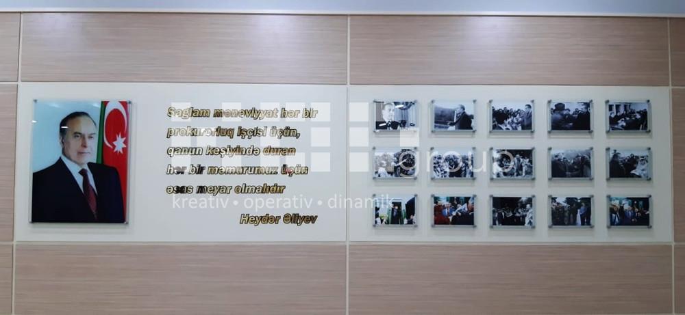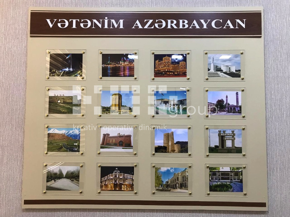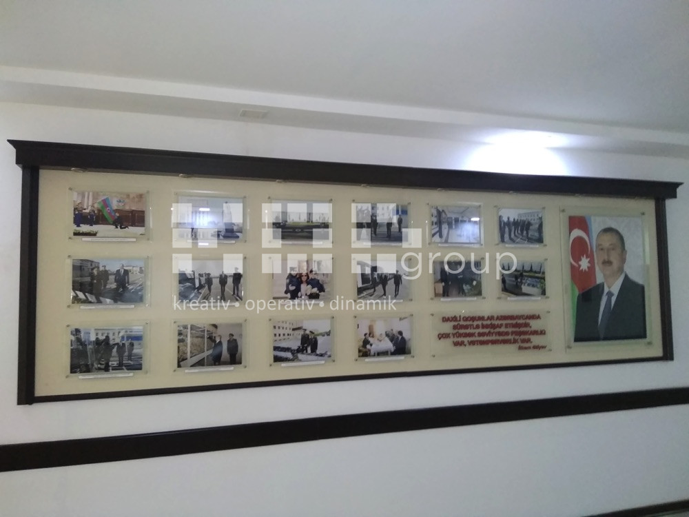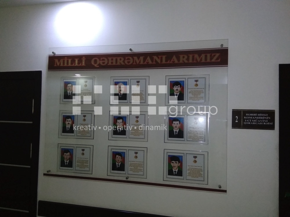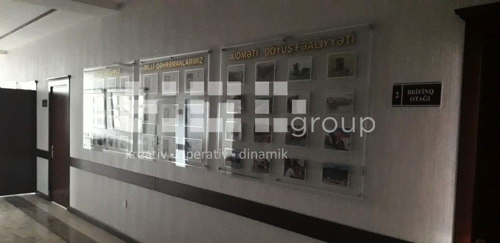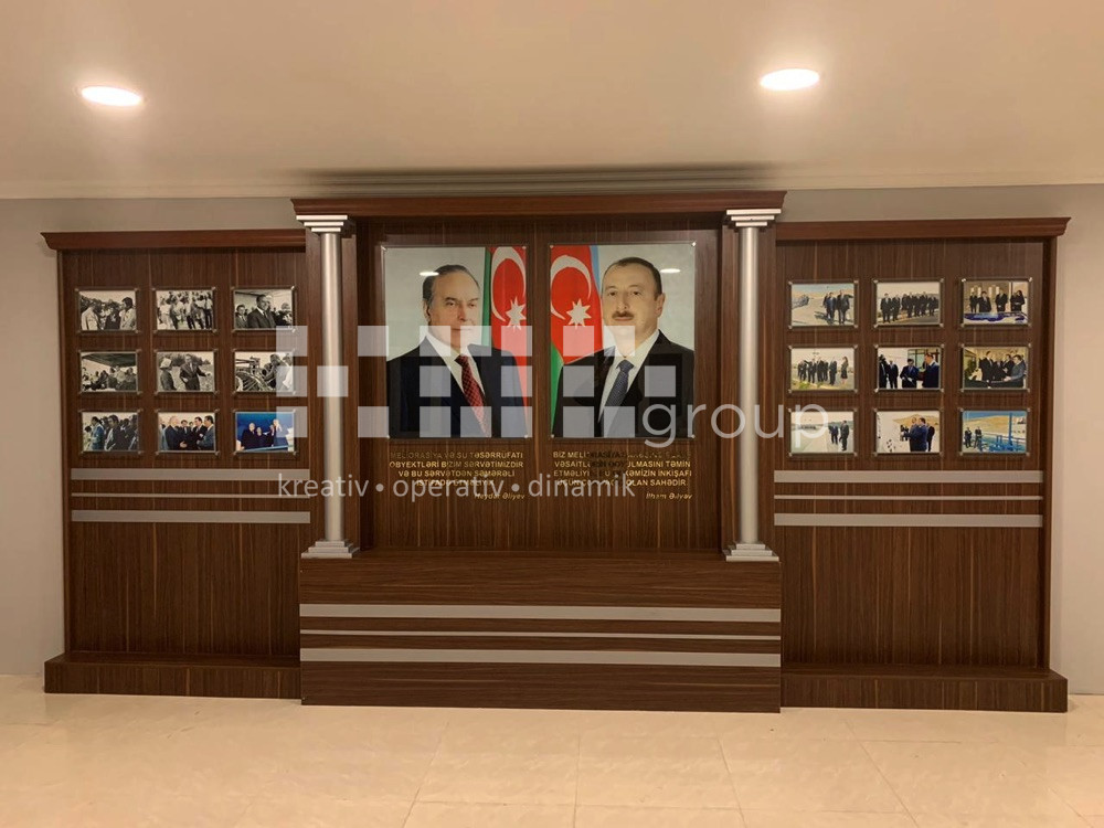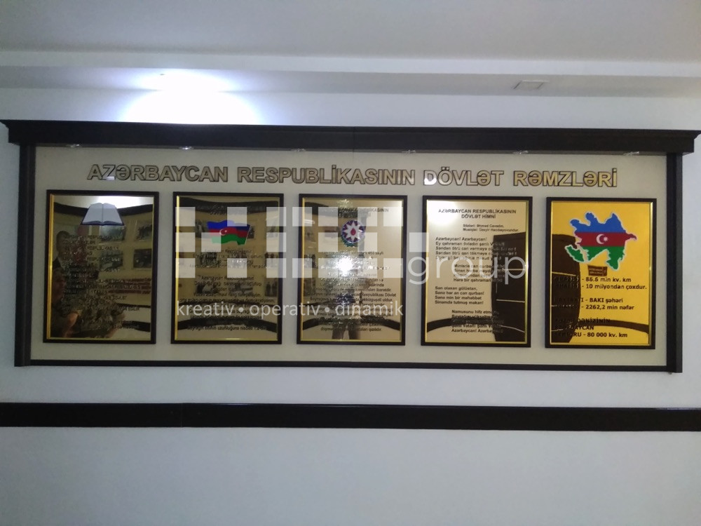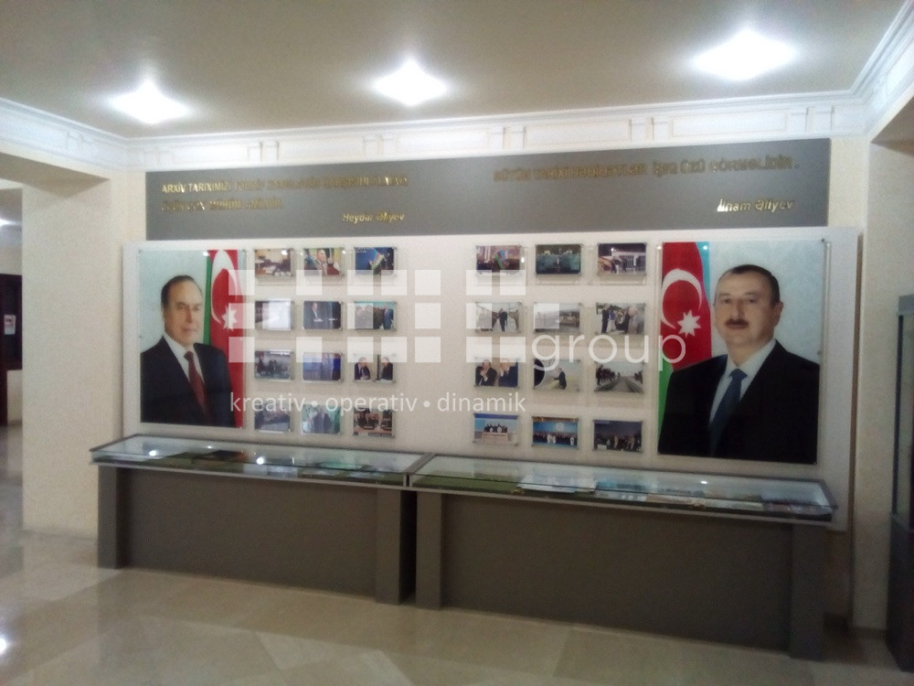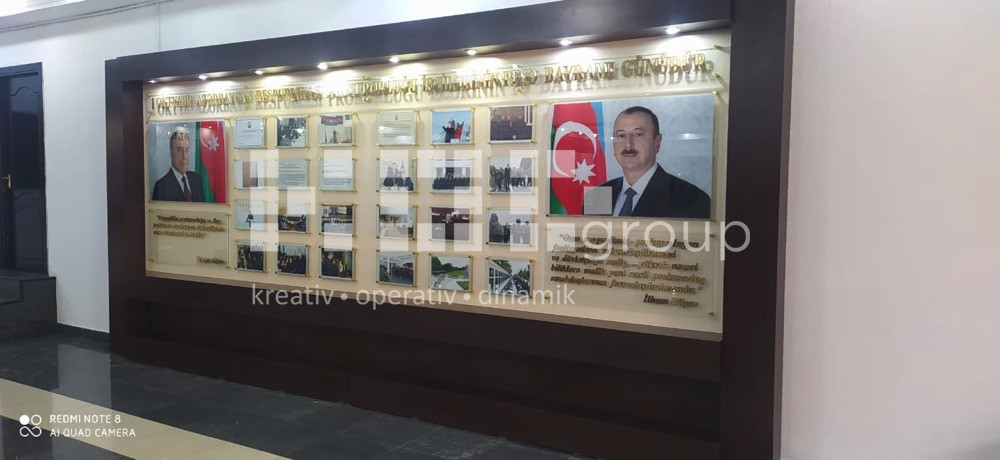 Stend və guşə – əsasən fabrik və zavodların, idman komplekslərinin, bağçaların, klinikaların, dövlət müəssisələrinin, muzeylərin, və s. Hollarına, giriş hissəsinə dövlət rəmzlərinin və dövlət başçısının fəaliyyətini əks etdirən müxtəlif forma və ölçülərdə guşələrin hazırlanması və quraşdırılması nəzərdə tutulur. İstifadə olunan materiallar əsasən Mdf, laminat, foreks, şüşə və s. olur.