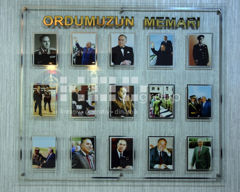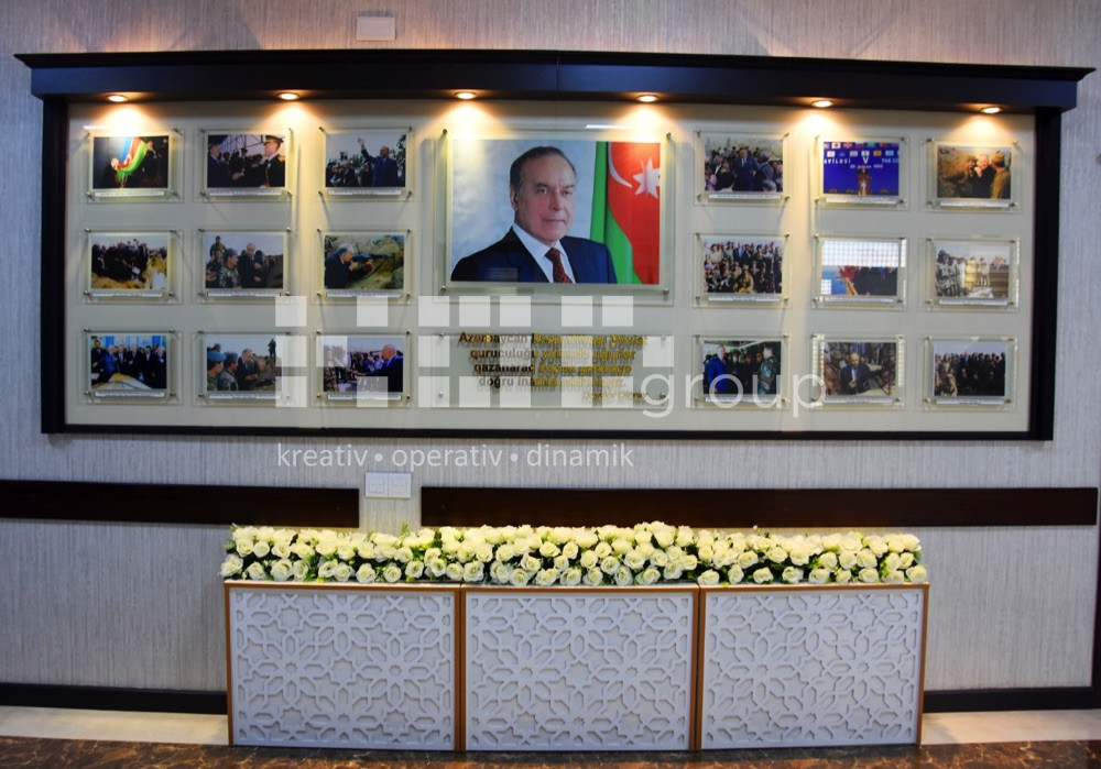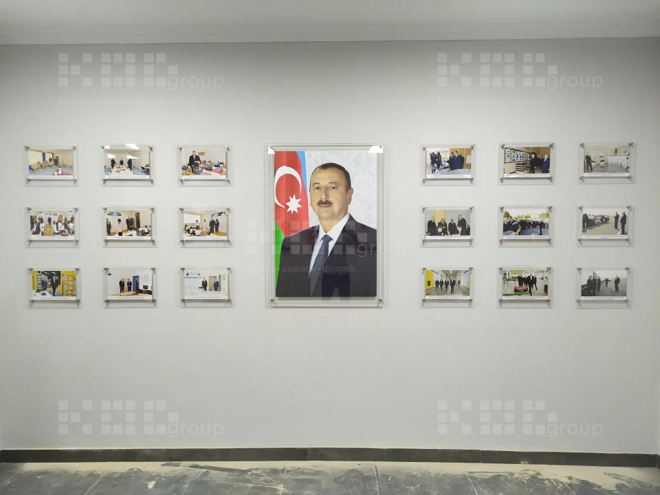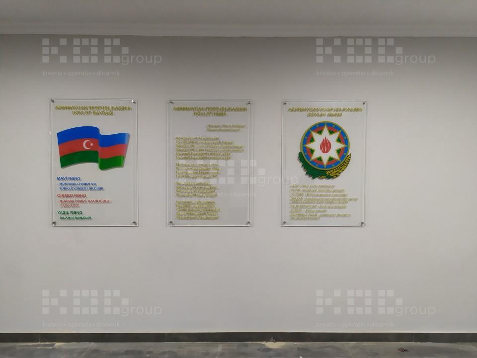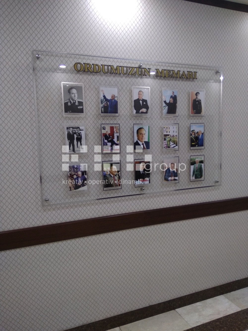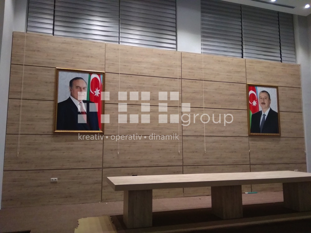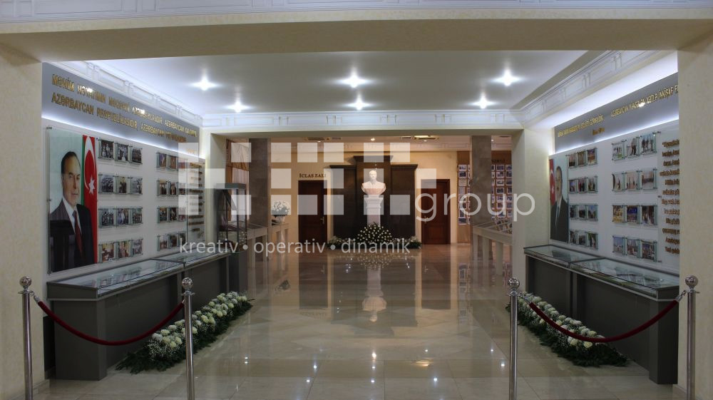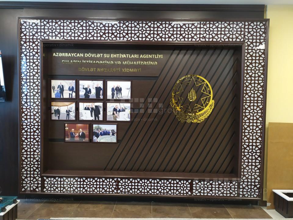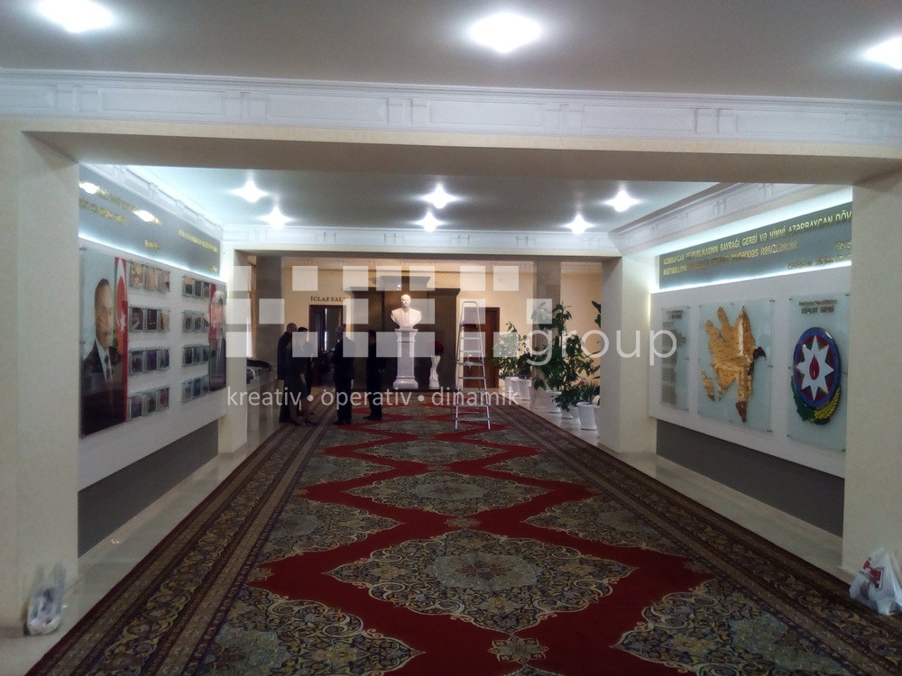 Stend və guşə – əsasən fabrik və zavodların, idman komplekslərinin, bağçaların, klinikaların, dövlət müəssisələrinin, muzeylərin, və s. Hollarına, giriş hissəsinə dövlət rəmzlərinin və dövlət başçısının fəaliyyətini əks etdirən müxtəlif forma və ölçülərdə guşələrin hazırlanması və quraşdırılması nəzərdə tutulur. İstifadə olunan materiallar əsasən Mdf, laminat, foreks, şüşə və s. olur.